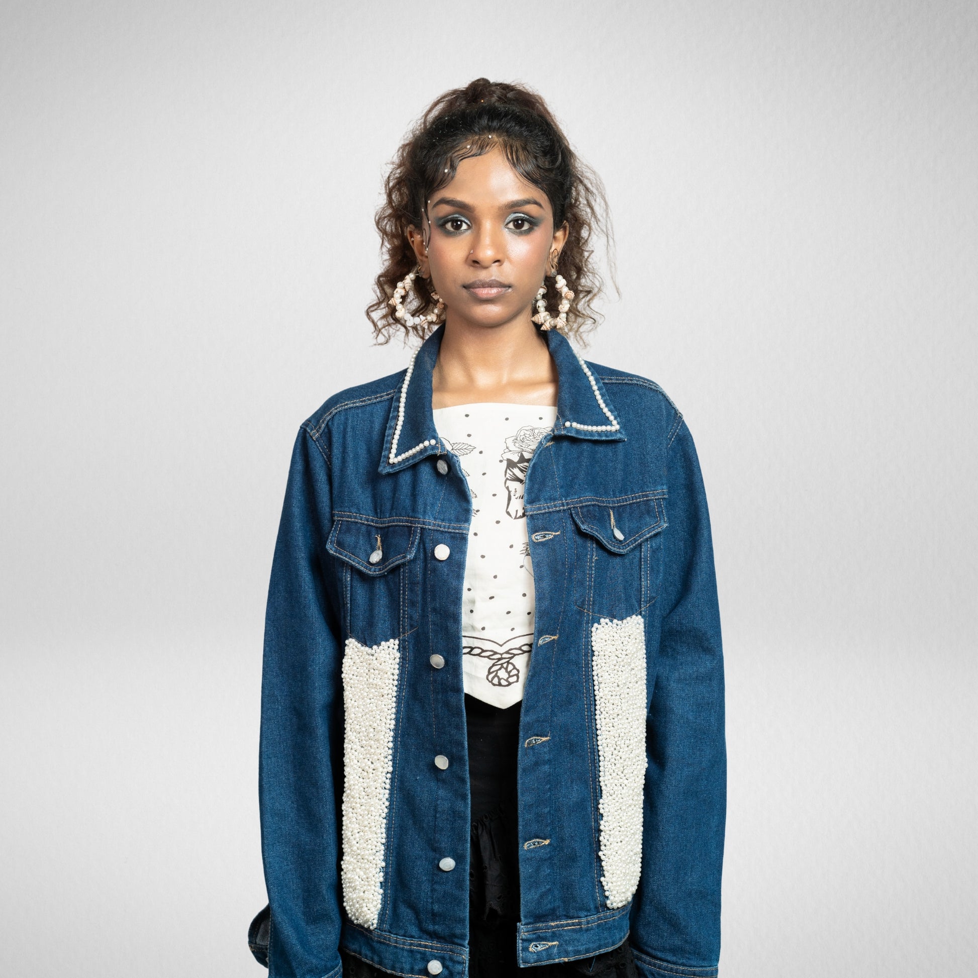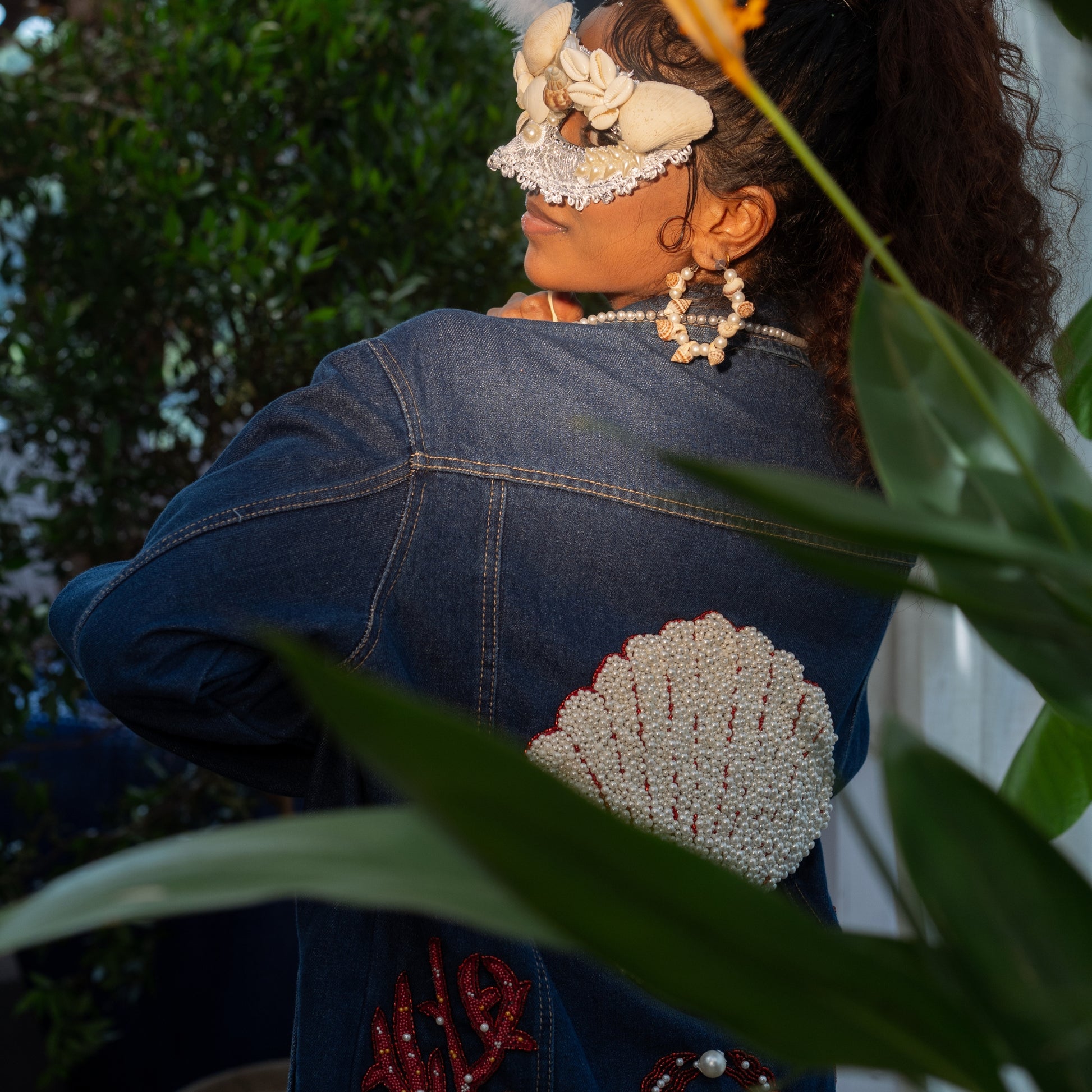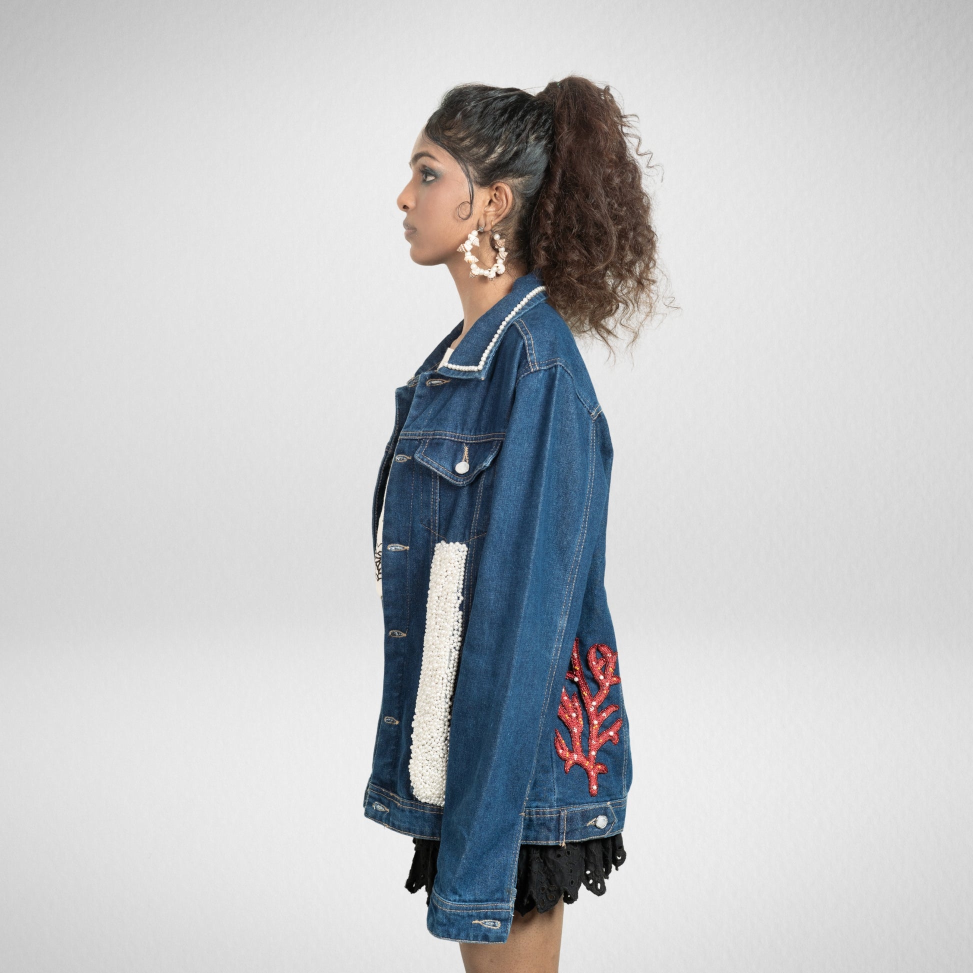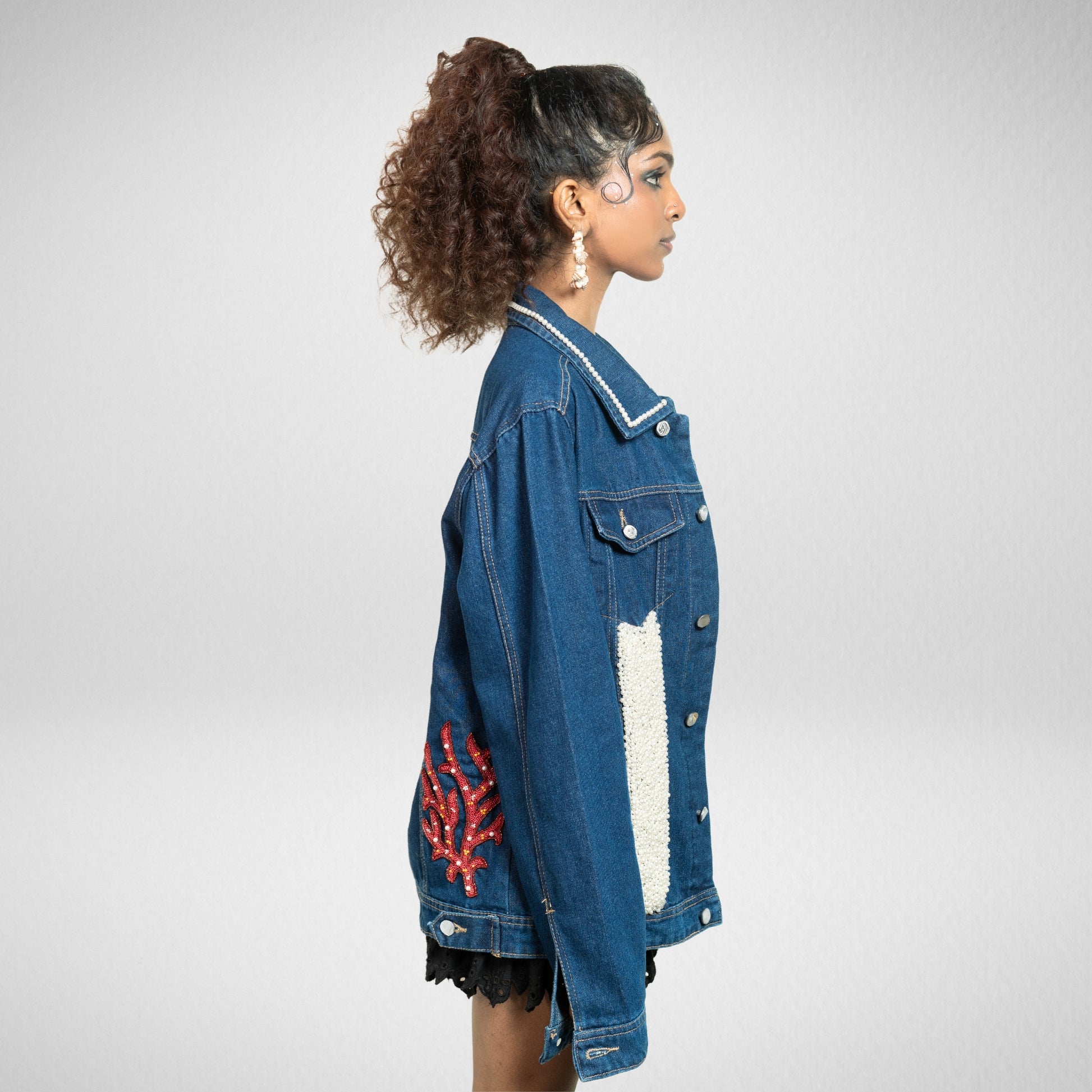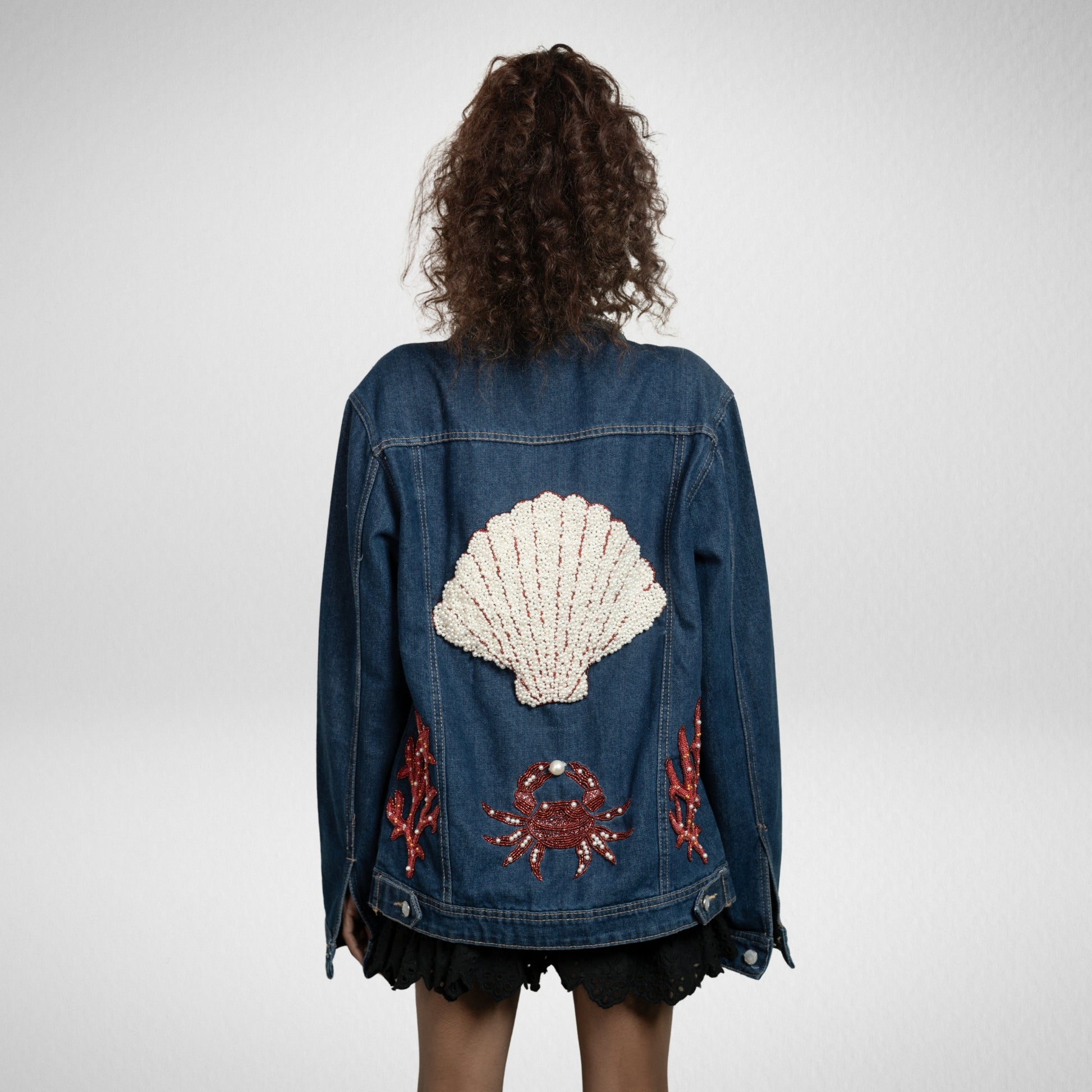 The Rare Catch Jacket features a bold pearl shell held by a red crab, surrounded by coral embroidery. It celebrates rarity, proving that treasures hidden deep within can become your greatest strength.