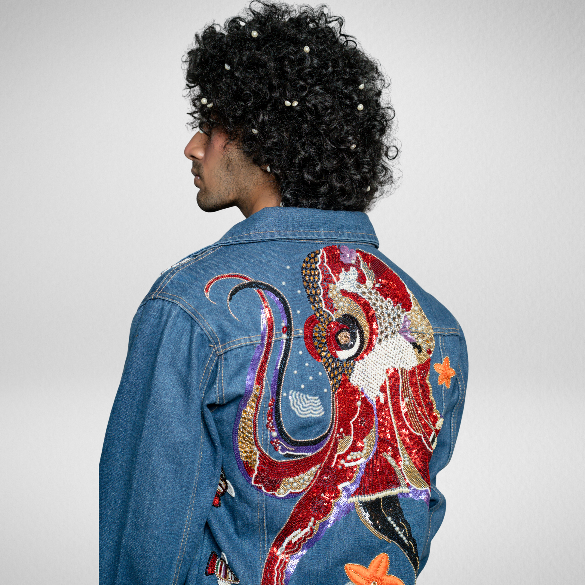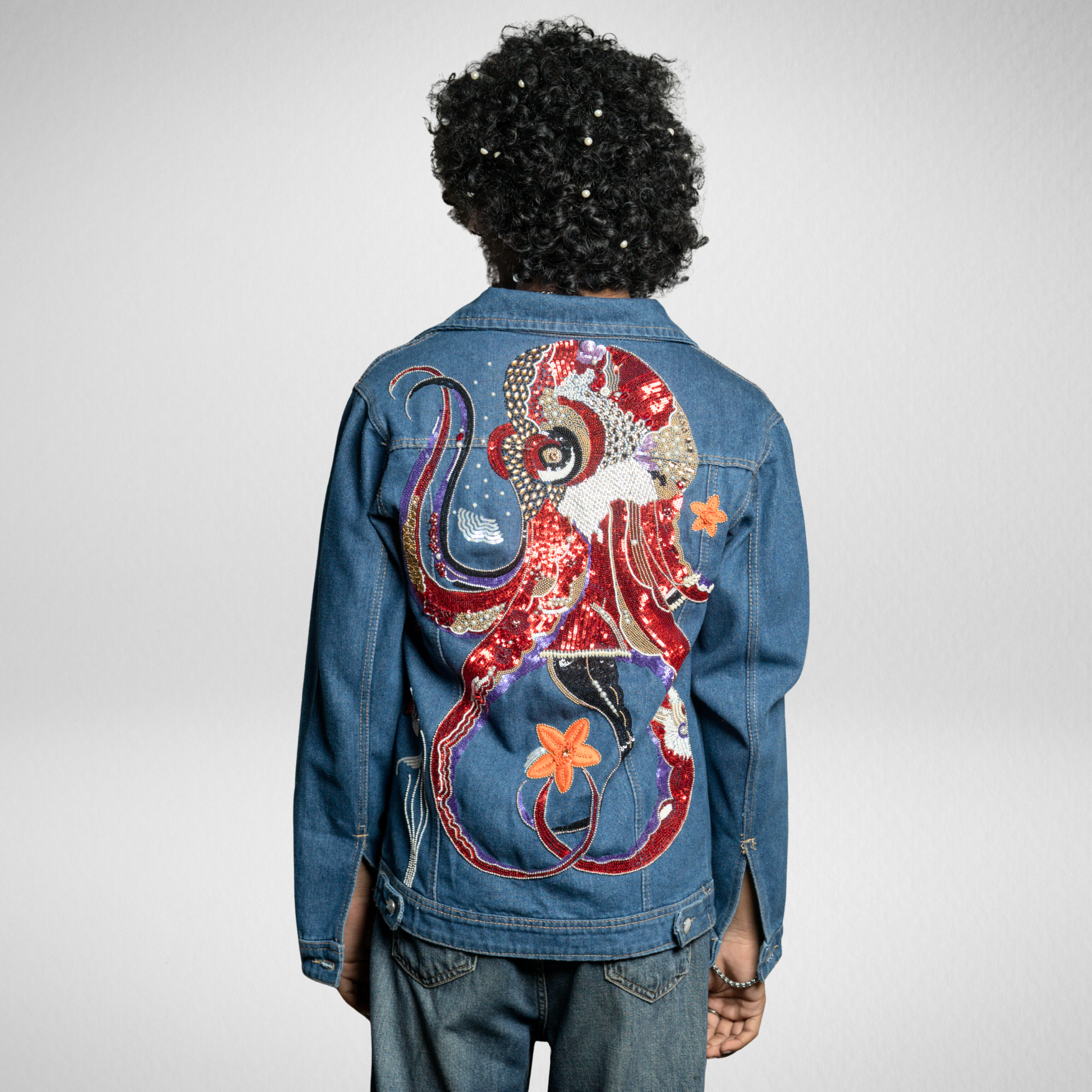 Inspired by the octopus, the Untouchable Jacket celebrates uniqueness. A vivid red octopus surrounded by fishes and star shaped flowers spans the back, while white and golden beads create refined front patterns showing the power of being different.